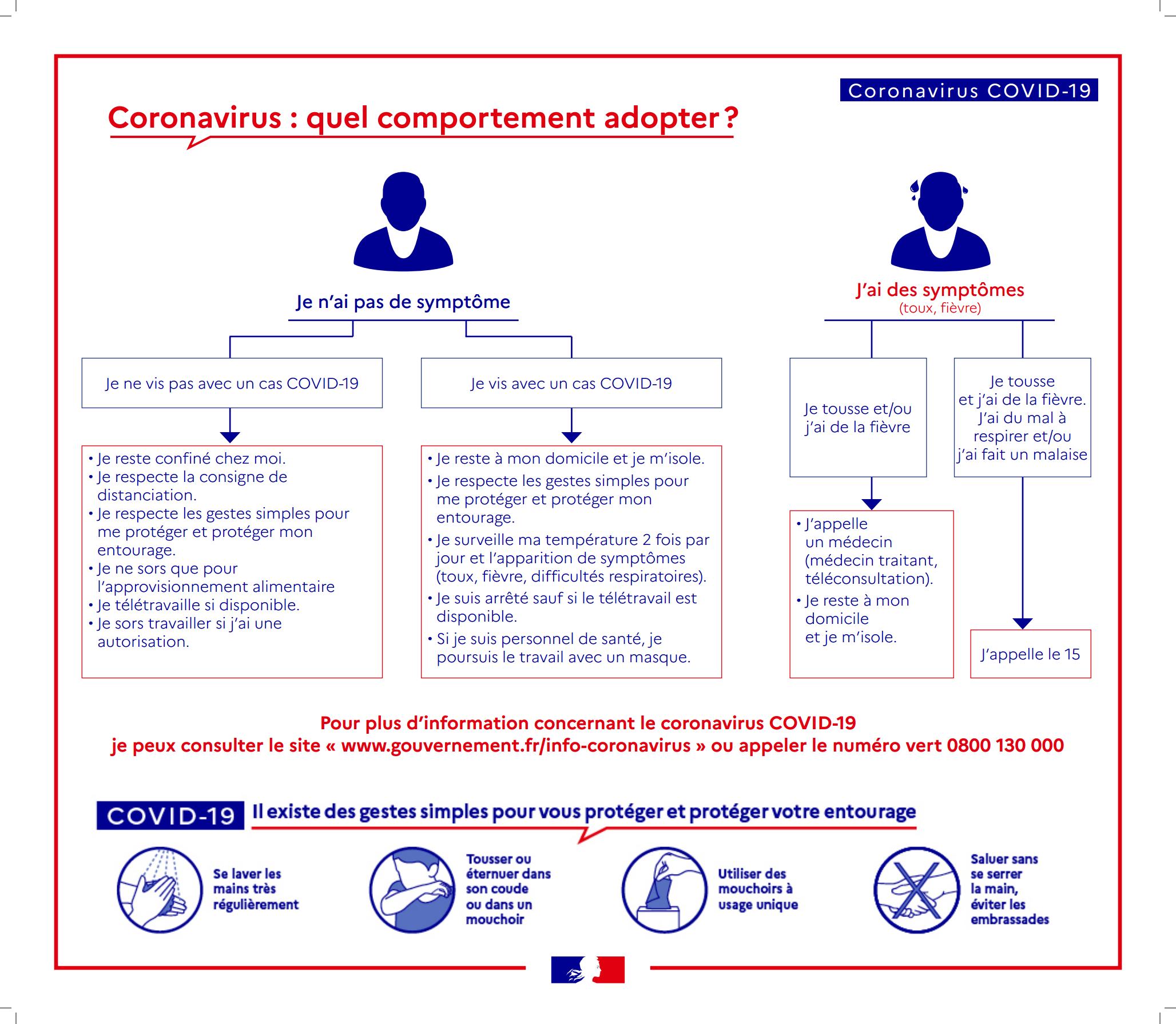 Comportement à adopter en cas de suspicion COVID19 : affiche du Ministère communiquée pendant la 1ère période de confinement qui reste d’actualité pour ce mois de novembre (dans le cas du futur déconfinement, les mesures seront à adapter selon le stade de l’épidémie et le protocole national en vigueur)
